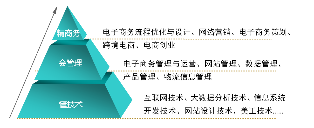 本专业旨在培养适应国家建设需要,“知识、能力、素质”协调发展,掌握电子商务系统设计和开发技术、电子商务运营管理、商务数据分析、计算机网络、经济学、市场营销和现代物流等基本理论,具备电子商务的技术、运营、网络设计、程序设计、经济贸易、法律等方面的知识与能力,能在各类企业、金融机构和政府部门,从事电子商务运营、管理及电子商务系统的规划、分析、设计和开发的高素质应用型人才。