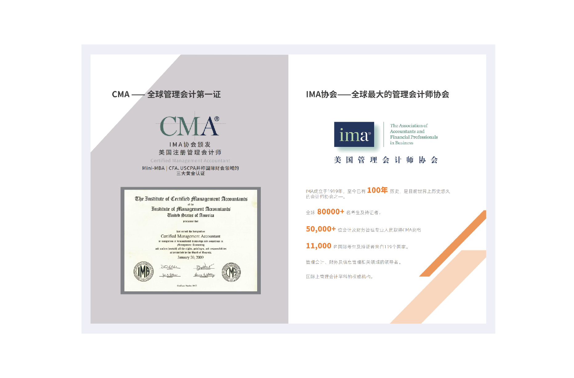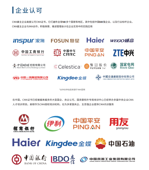 IMA旗下的注册管理会计师认证(Certified Management Accountant,简称CMA)是对会计和财务专业人士的权威鉴定。CMA 考试最鲜明的特点是知识覆盖面很广,具有较强的实用性和可操作性。CMA认证是一个完整的体系,不仅仅需要通过两门考试,还需要综合评估学员在管理会计及财务管理方面的相关工作经验、教育背景、职业道德规范,同时IMA协会规定,CMA会员通过考试后,必须以后续教育的方式保证所学知识体系的更新以及能够在实践中运用。