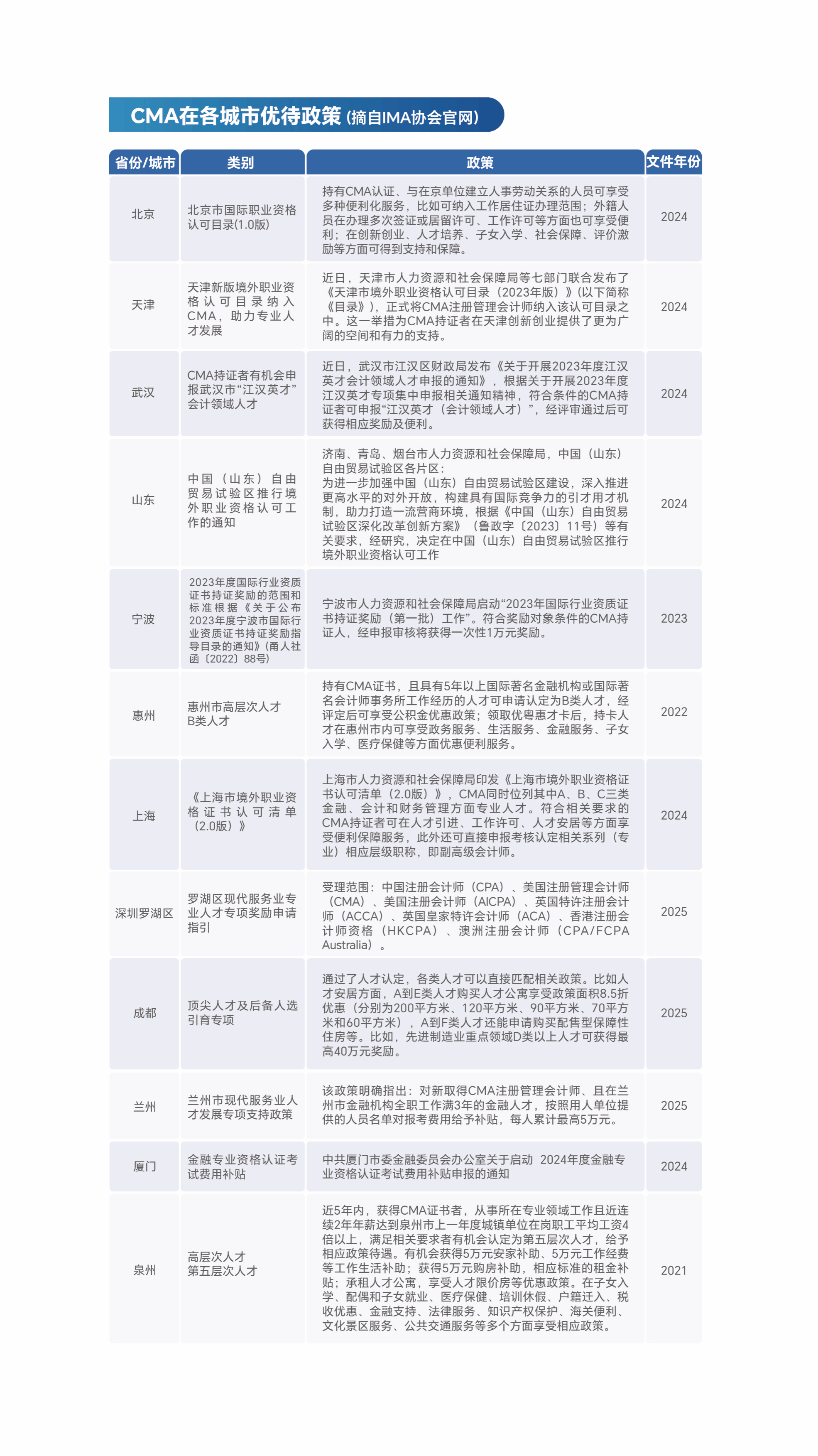CMA在各城市优待政策