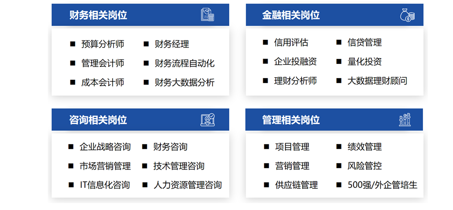 财务管理CMA方向班学生未来将拥有广阔的就业选择面,可在500强企业、大型跨国公司、大型国企与金融机构等从事智能财务、管理咨询、商业分析、市场营销、投资管理等各类高薪职业。