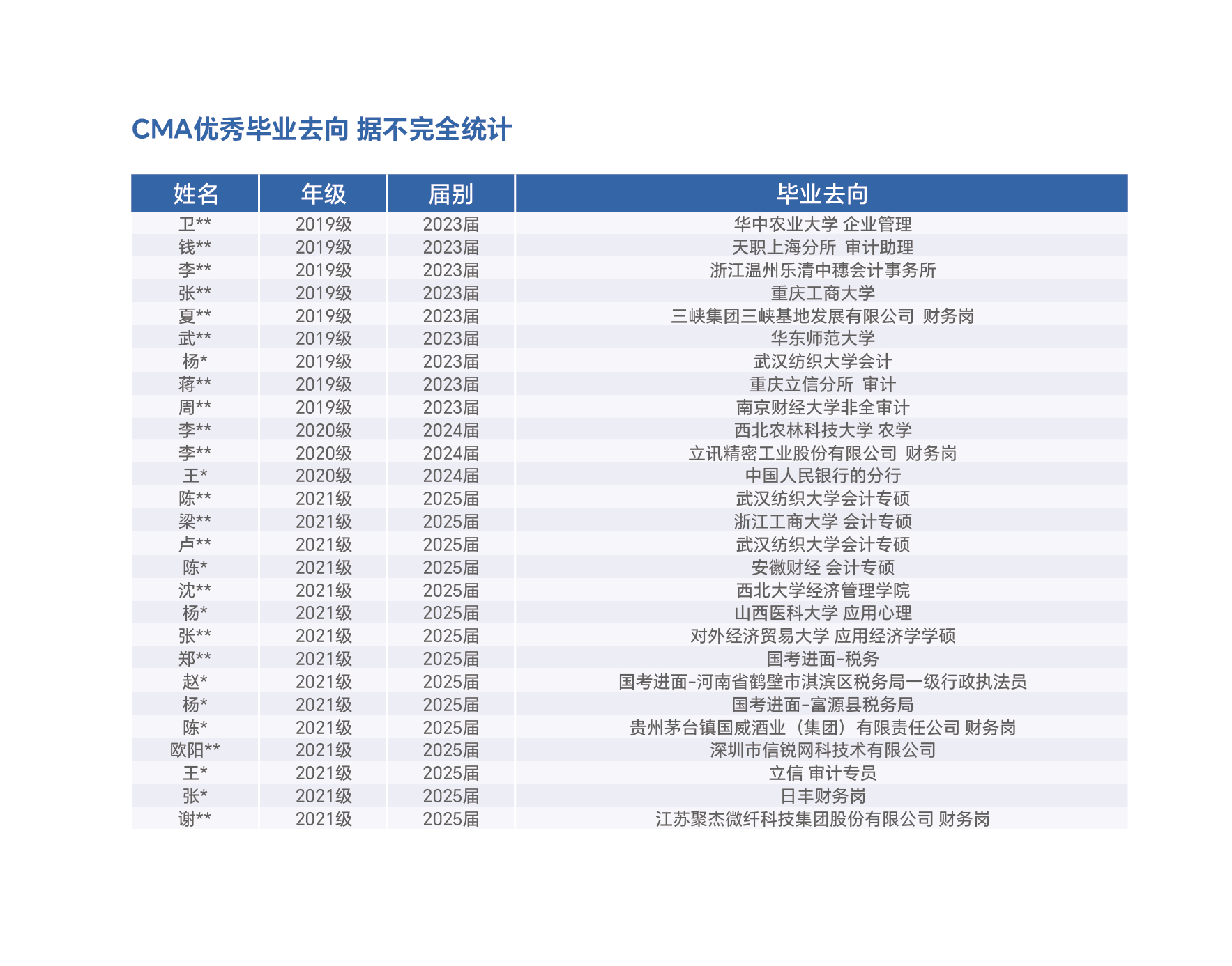 通过对CMA专业课程体系的精心打磨和对学生实践能力的重点培养,学生们的专业素养和解决实际问题的能力得到了显著提升。在2025年4月的CMA认证考试中,yl9193永利CMA专业22级、23级共计 36名学生参考,其中33 人顺利通过考核,通过率高达92%。在职业发展和学术深造方面,CMA专业2025届毕业生也展现出强劲势头,整体就业率达97%。