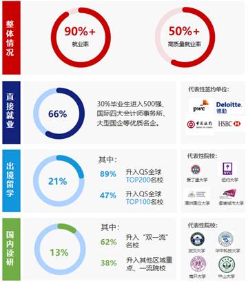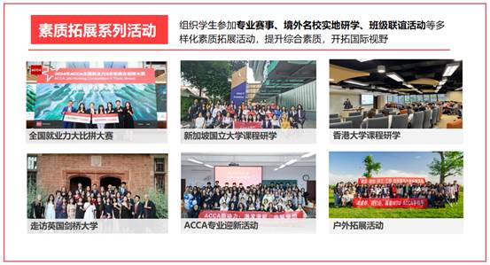 会计学专业(ACCA方向)学生未来将拥有广阔的就业选择面,可在跨国公司、专业性会计师事务所、国企与金融机构等各类大型企事业单位从事财务、税务、商业分析、投融资、运营与管理等高薪职业。