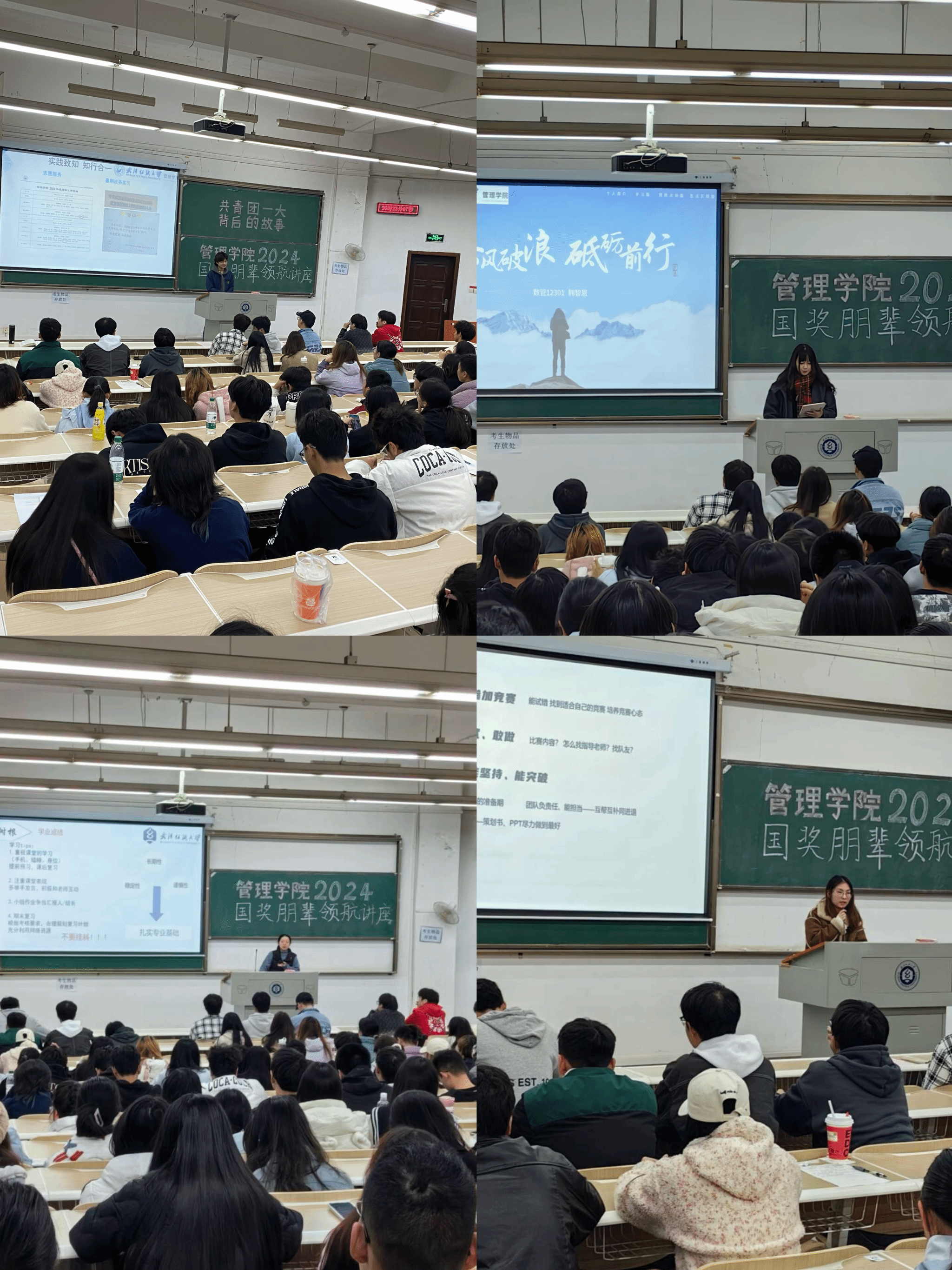 胡心远同学在分享参加文体活动的心得时,强调了文体并举的重要性,提倡全面发展。他认为,通过参与文体活动,学生不仅能够锻炼身体,还能培养团队协作能力,这对于个人综合素质的提升至关重要。韩智恩同学则分享了提高学业成绩的心得,她强调了自主学习的重要性,并提倡复刻高中时期的优良学习习惯,以提升学术上的竞争力。她提到,良好的学习习惯和自我管理能力是取得优异成绩的关键。张芬同学则分享了参与社会实践和志愿活动的心得。她鼓励学弟学妹们既读万卷书,也要行万里路,通过实践活动去感知生活、开拓视野。刘晓宇同学从学科竞赛的角度出发,鼓励学弟学妹们在参加竞赛时要做到敢问、敢试、敢做,并且能够持之以恒。她强调,竞赛不仅是检验学习成果的平台,更是锻炼创新思维和解决问题能力的舞台。