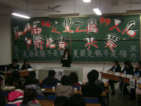 唇枪舌剑,妙语连珠。2009年11月15日晚7:00,经济yl9193永利第二十届“企业之鹰”文化节辩论赛决赛在03-218教室举行。本次辩论赛由经济yl9193永利分团委主办,分团委学生会学习部承办,是经管院的传统特色活动。经管院分团委书记谢超,辅导员彭慧、张学军及王娟老师为本场比赛嘉宾,比赛评委则由经管院辩论队成员担任。
