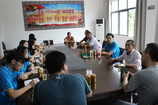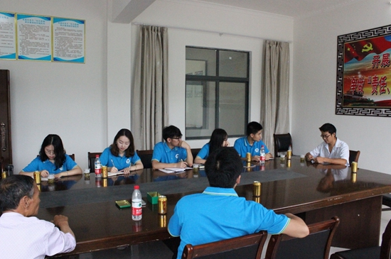 在双泉村村委会会议室里,村党委书记晏书记向实践队阐述了双泉村的基本情况,双泉村的经济来源以粮食、竹木为主,油茶、草药为辅。由于物流基础设施不完善,使得村民依旧以传统渠道出售农产品。在网络方面,双泉村的网络普及率较低,360户中仅十几户已安装宽带。九集镇双泉村为响应国家 “精准扶贫”政策,在资助贫困户、贫困村发展产业方面取得了一定的成绩,比如通过集中贫困户对其实行股份制发展的方式,光伏产业每年就可带来六七万的收入。