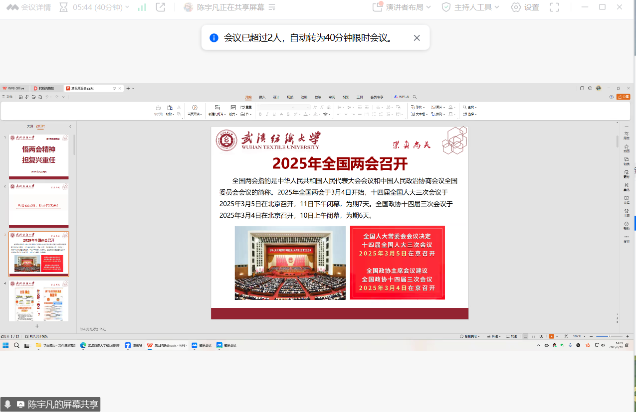 2023级各班主任通过PPT向同学们详细介绍了2025年全国两会的基本情况,包括会议议程、重要决策以及《政府工作报告》中的关键内容,让同学们对两会有了全面而深入的认识。同学们围绕就业创业、科技创新、教育改革等方面开展激烈讨论,大家纷纷表示“政府工作报告中对大学生就业创业的重视,让我们充满信心。我们要努力提升自己的专业技能,为未来的就业做好充分准备。”