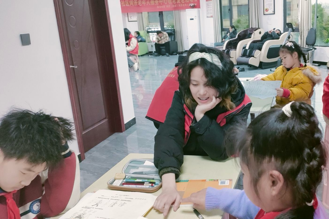 图一为志愿者辅导小朋友写作业