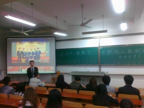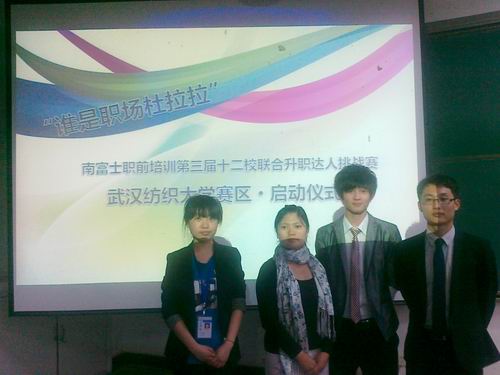 2012年4月18日晚7时,南富士职前培训第三届十二校联合升职达人挑战赛在我校阳光校区教学楼03-120举行启动仪式宣讲会。此次宣讲会由阳光人力资源服务中心承办,11届,10届学生参与。启动宣讲会由阳光人力资源中心会长杨畅做了简短的开场白,邀请南富士职前培训成长顾问张晓颖老师主持。