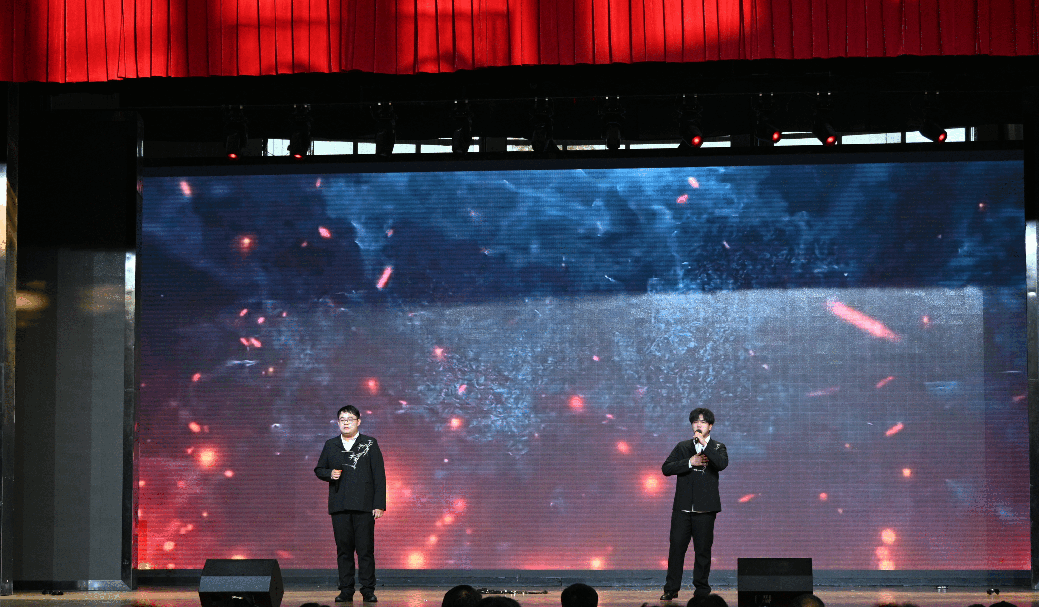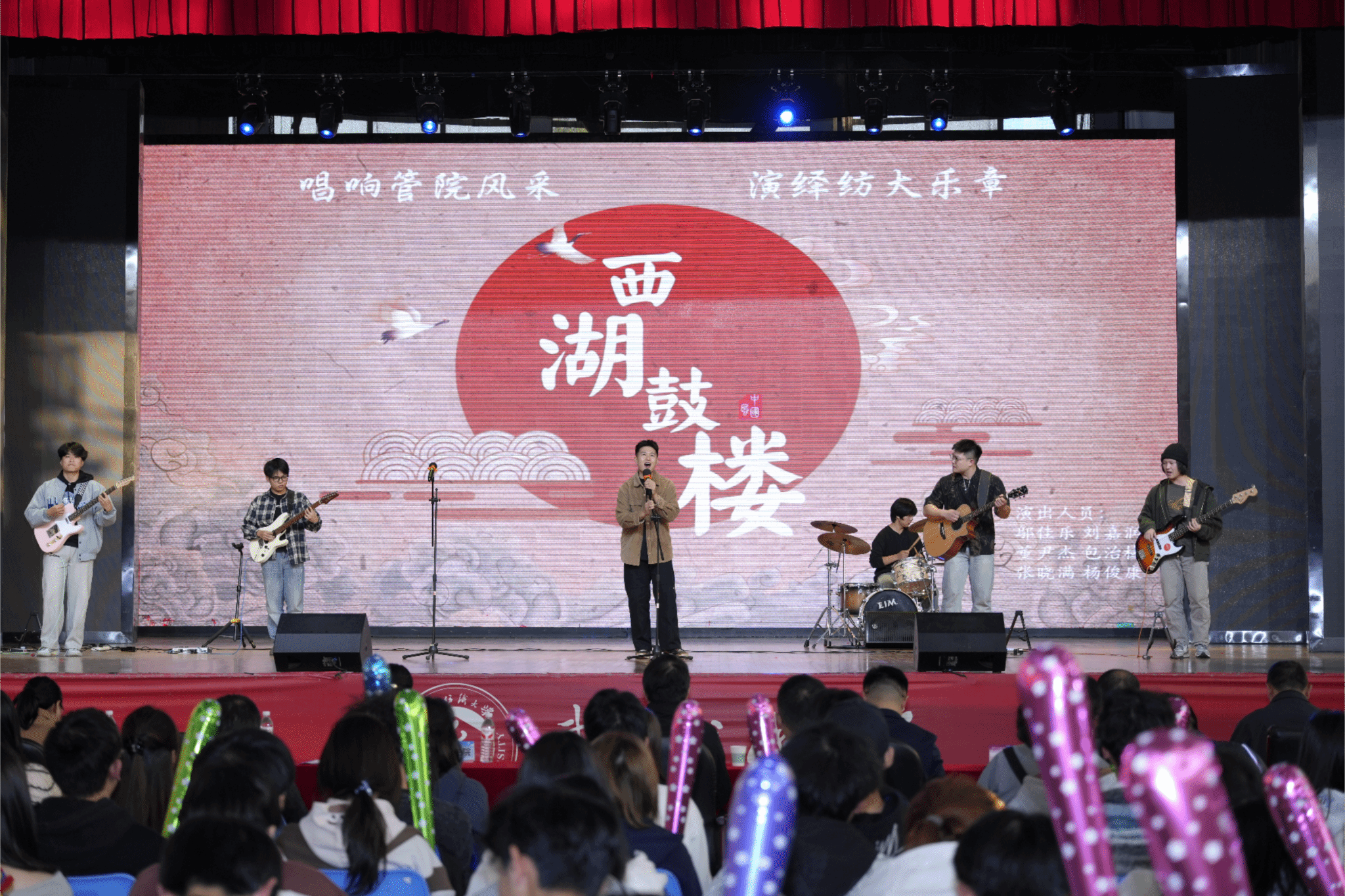 联欢会在充满活力的摇滚联唱中拉开帷幕,同学们以饱满的热情演绎《鼓楼》与《西湖》,电吉他的激昂旋律搭配沙哑而富有张力的歌声,瞬间点燃全场氛围。