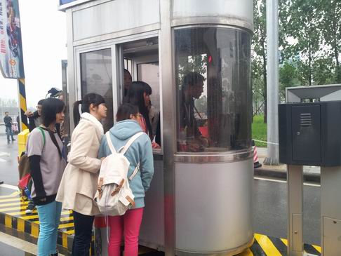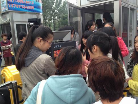 (志愿者在岗亭认真学习工作人员的操作方法)