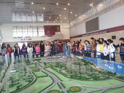 ( 武汉国际博览中心人事处杜凡带领志愿者熟悉沙盘)