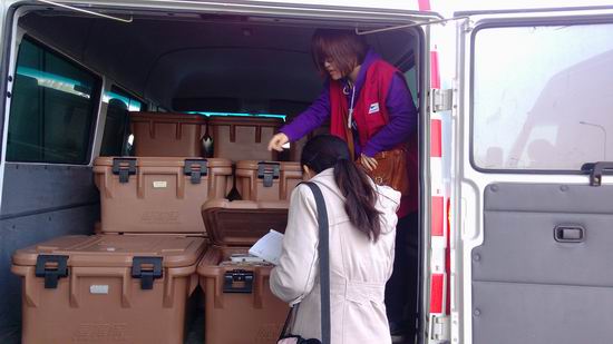 (后勤部志愿者在仔细清点装箱数目)
