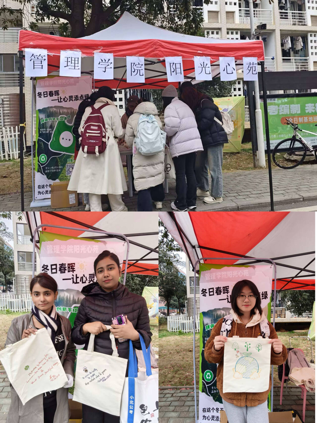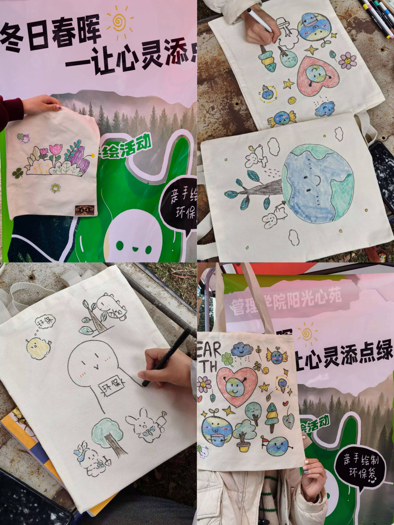 活动现场气氛热烈,同学们纷纷拿起画笔,用环保颜料在布袋上绘制自画像,或创作与地球保护、绿色生活相关的图案和标语。五彩缤纷的创意作品让冬日校园焕发勃勃生机,也传递出同学们对生命、自然与美好生活的热爱。