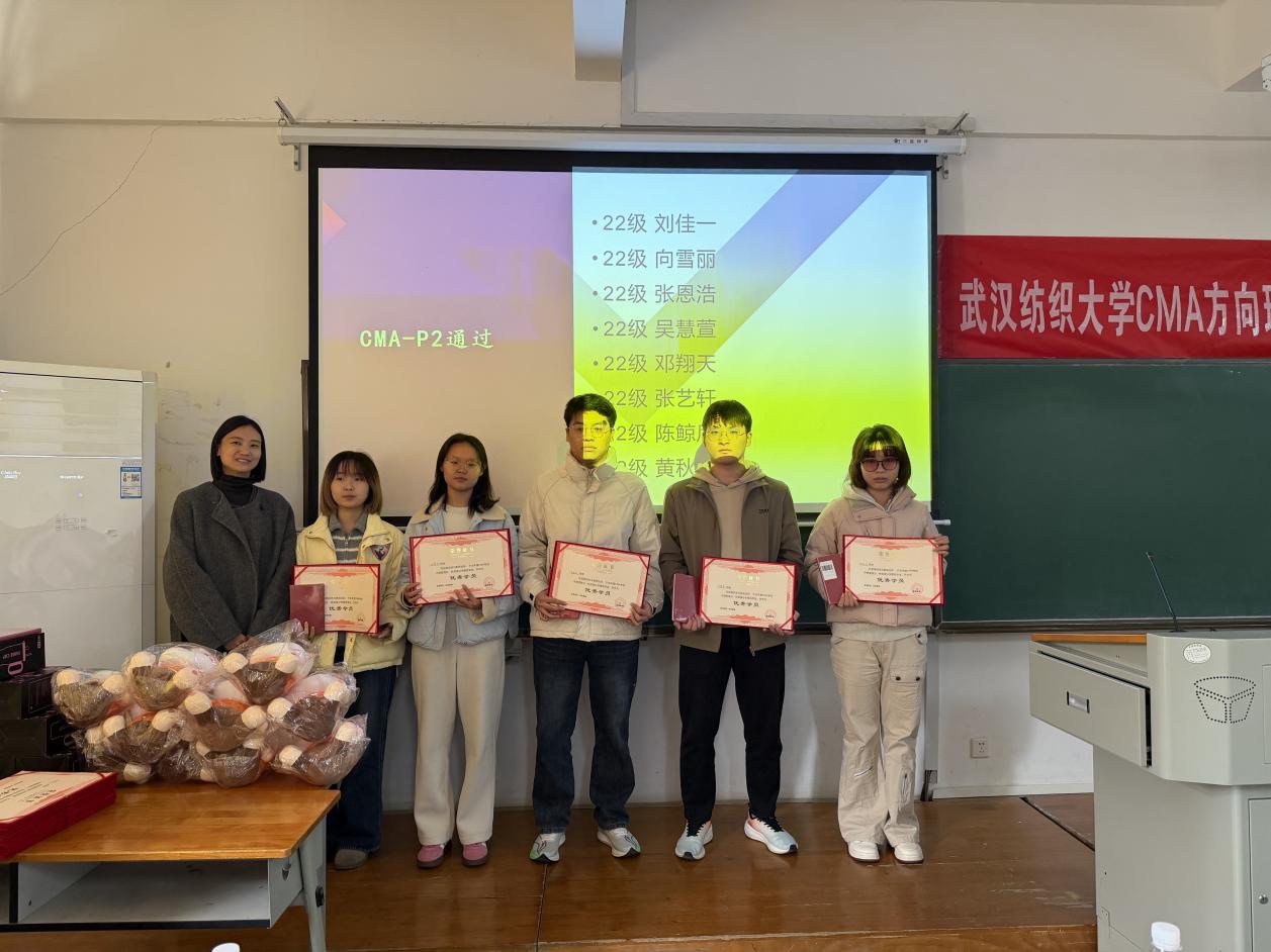 随后,高顿教育谢晖经理为“CMA-P2 考试通过奖”获奖学员颁奖。22级刘佳一、向雪丽、张恩浩、吴慧萱、邓翔天、张艺轩、陈鲸后、黄秋燕等同学凭借扎实的专业功底顺利通过考试,他们在台上与颁奖嘉宾合影留念,笑容中洋溢着奋斗后的喜悦。