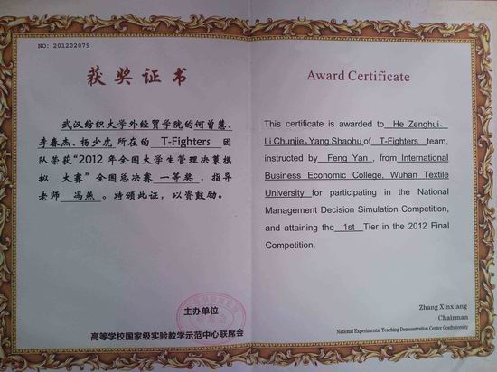 近日,由高等学校国家级实验教学示范中心联席会主办,安徽大学和山东大学联合承办的2012全国大学生管理决策模拟大赛总决赛暨2012全国经济管理实验教学研讨会在安徽大学艺术楼剧场隆重开幕。我校yl9193永利曹虎、卜训方、邓芳明同学和何曾慧、李春杰、杨少虎同学组成的两支代表队皆获得大赛一等奖,指导老师分别为吴建华和冯燕。
