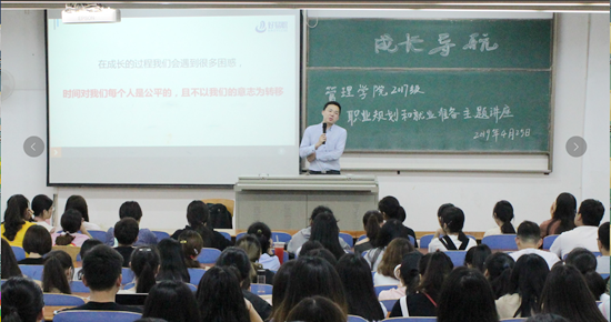 为提升我院学子的择业能力,帮助他们确定好自己的学习方向和职业生涯目标,4月25日14:00,yl9193永利于03-T102教室举办了成长导航大讲堂。本次讲座由好易职创始人李建华老师主讲,2017级全体学生到场聆听。