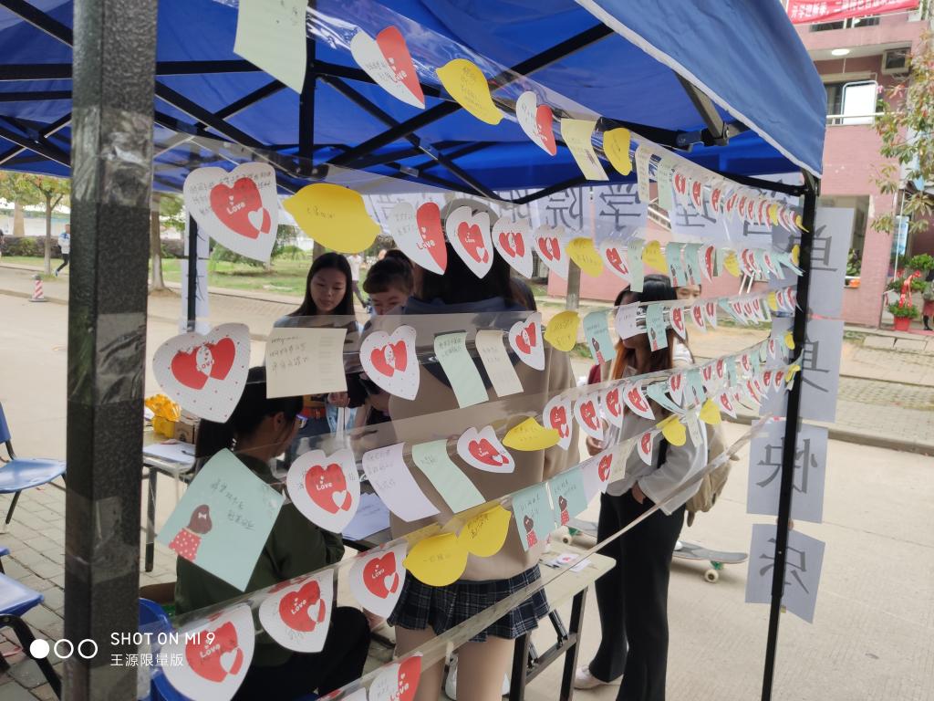 活动开始,由参与者在便利贴上写出自己的心里话,并贴在专门设置的心愿墙上。随后请参与者在一张白纸上画出一个太阳,太阳在不同的位置代表参与者不同的心理状态,通过这项测试能了解到同学们在社交方面是否存在问题。同时,阳光心语工作站的小干事们还寻找了许多难易程度不同的大冒险游戏,将大冒险任务做成纸条放在纸盒内,参与者从纸盒中抽取纸条并完成纸条上的内容,不同程度的任务可以得到不同的奖品。