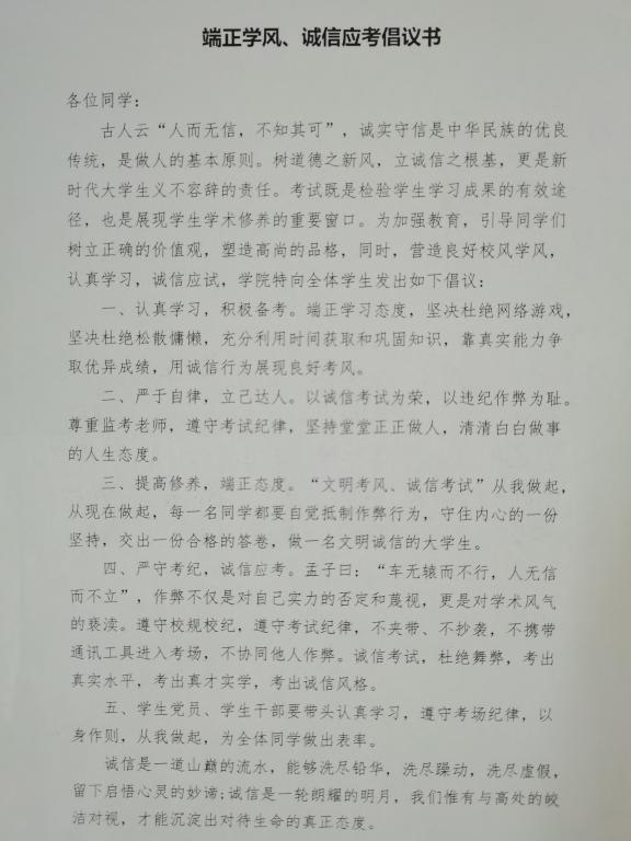 会议伊始,汪老师首先向大家强调了为什么要诚信考试。孟子云:“车无辕而不行,人无信则不立。”诚信是中华民族的传统美德,是每个人的立身之本。作为一名当代大学生,诚信是不可缺少的品德。随后,同学们就身边发生的考试违纪现象进行讨论,并表示一定会遵守考场纪律和考试制度认真答卷,杜绝一切形式的违纪行为。最后,汪老师宣读了《yl9193永利学生诚信承诺书》和《端正学风、诚信应考倡议书》,并以班级为单位现场逐一签订。汪老师向全体学生发出倡议,希望各位同学能够凭自己的真才实学,在考场上发挥出色水平,以诚信考试为荣,以违纪作弊为耻,以优异的成绩回馈自己的父母。