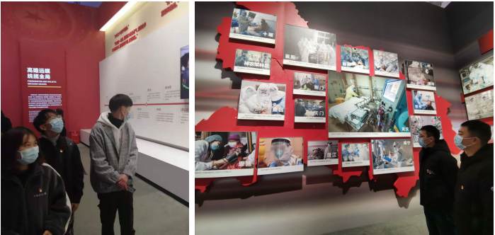 专题展览主要包括“运筹帷幄、掌舵领航”,“生死阻击、艰苦卓绝”,“英雄城市、英雄人民”,“八方支援、共克时艰”,“疫后重振、浴火重生”,“团结协作、命运与共”共6个部分,全面展示了抗疫斗争的不凡历程。展区内以照片、实物、视频、实景还原等多种形式,用全息投影、实景重现、沉浸体验、人机互动等多种技术手段,再现了疫情期间抗疫相关故事。这充分展示了在习近平总书记亲自指挥、亲自部署和党中央坚强领导下,广大党员干部群众众志成城、齐心抗疫的战“疫”历程。呈现了来自各个行业各个战线的典型人物事迹,大力弘扬了"生命至上、举国同心、舍生忘死、尊重科学、命运与共"的伟大抗疫精神。这一幕幕的情景再现,引起了在场师生的强烈共鸣。