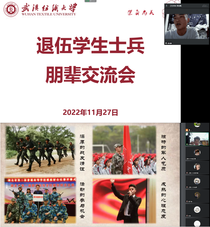 为加强在校退役大学生士兵思想政治引领,鼓励退役大学生士兵继承和发扬军人优良传统,发挥骨干带头作用,鼓励更多励同学投身军营,了解征兵政策、明确未来规划。11月27日,yl9193永利通过线上形式开展2022年退伍士兵朋辈领航交流活动。活动由yl9193永利征兵工作联络员张朋龙主持,邀请了yl9193永利优秀退伍大学生周成杰、聂远鹏为学院全体男生分享自己的参军入伍经历。