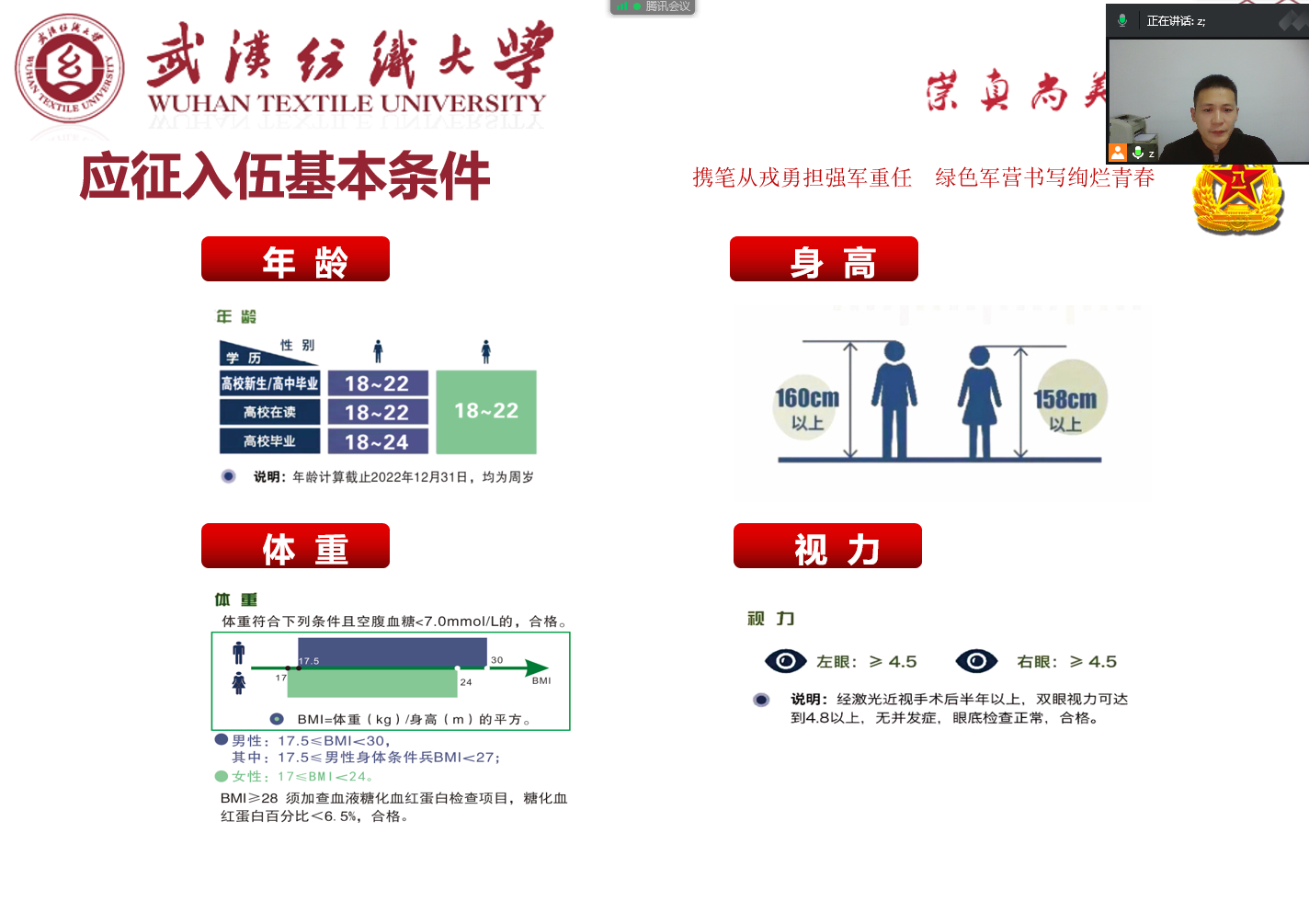 “传承红色基因、携笔从戎报国”。为积极响应国家大学生征兵入伍的号召,切实做好学院2023年春季征兵工作。11月27日下午,yl9193永利通过线上方式开展征兵工作动员大会。学院各年级辅导员、全体男生参加此次大会,会议由征兵联络员张朋龙主持。