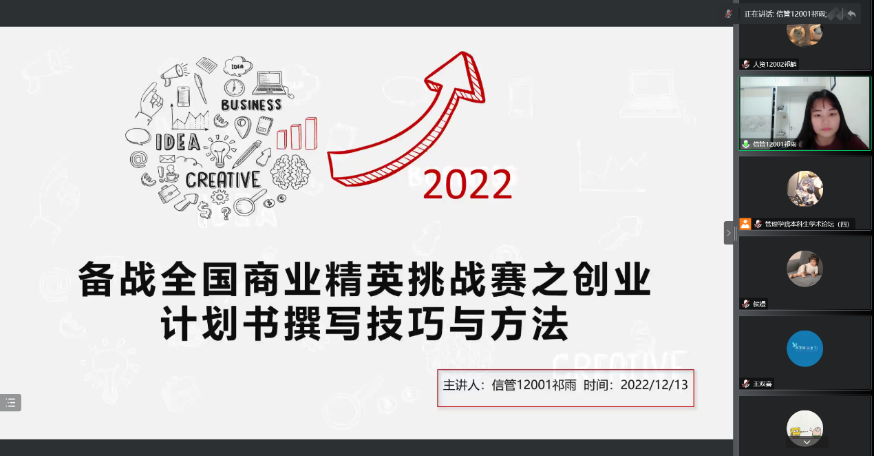 祁雨同学先向大家简要介绍了一下全国高校商业精英挑战赛,然后着重介绍了比赛中创业计划书撰写技巧与方法。她的介绍从创业计划及创业计划书的含义、创业计划书的主要内容和创业计划书写作中的注意事项三部分展开。在讲解创业计划书的主要内容时,她详细地向同学们讲述了计划书所涉及到的各方面内容以及撰写要点,并且分享了自己备赛时的一些经验心得。
