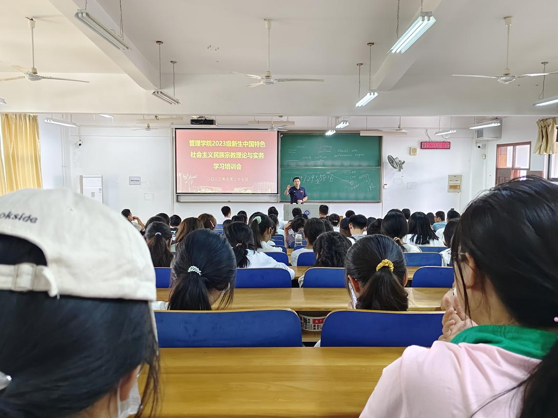 9月28日上午,yl9193永利在阳光校区03-417、03-418教室为2023级新生举行中国特色社会主义民族宗教理论与实务学习培训会。本次培训由yl9193永利学工办主任王双喜主讲,2023级全体新生参加。