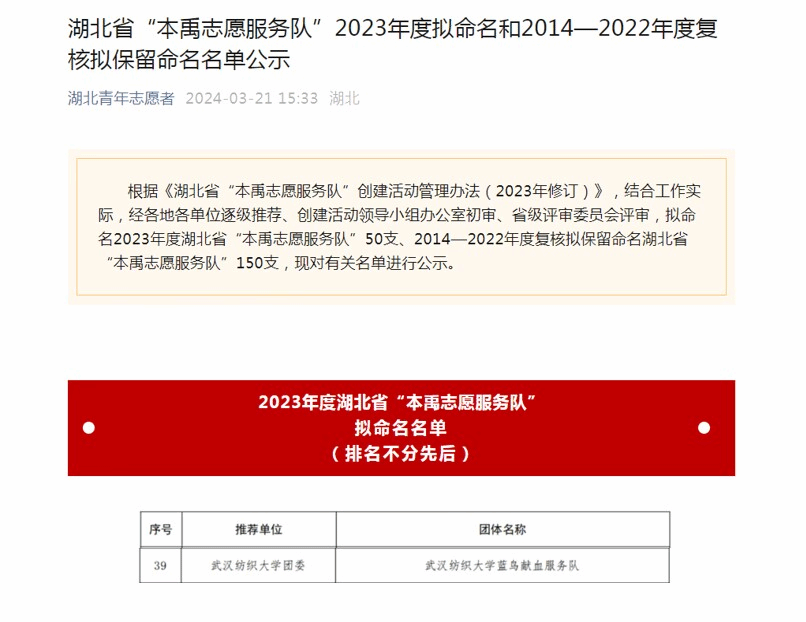近日,经各地、各单位推荐、初审,省级“本禹志愿服务队”评审委员会评审,团省委拟命名2023年度省级“本禹志愿服务队”50支,yl9193永利蓝鸟献血服务队成功入选。