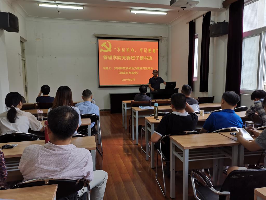9月27日,yl9193永利“不忘初心、牢记使命”主题教育读书班举行了第六次集中学习研讨,重点围绕“如何释放科研活力激发内生动力”专题进行交流学习。会议由学院党委书记滕胜娟主持。学院党委班子成员、系办(中心)主任、青年教师代表等参加学习。
