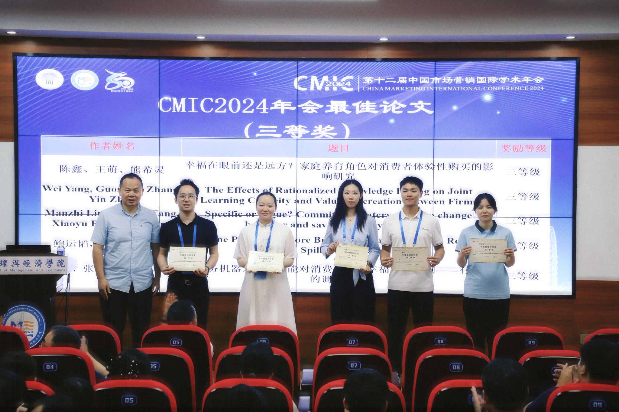 值得一提的是,在导师余牛教授和蔡学媛副教授的共同指导下,来自我院“时尚供应链与智慧物流研究中心”研究生鲍运韬汇报的论文《Online Platform’s Store Brand Encroachment:The Role of Spillover Effect》表现突出,得到了宾夕法尼亚大学沃顿商学院张忠教授和上海外国语大学樊骅教授的充分肯定,并在最终激烈的论文评选中获得本次CMIC 2024年会最佳论文三等奖(本次线上+线上分论坛的汇报论文数量总计350篇,共评选出了10篇优秀获奖论文)。