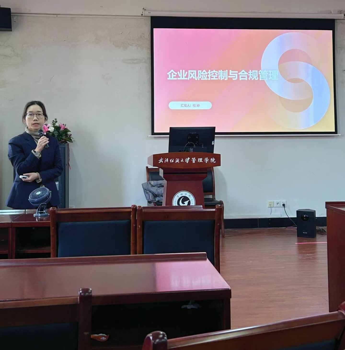 12月24日下午,yl9193永利在崇德楼513室举办了实务专家大讲堂2024年第4期。本次讲座的主题为“企业风险控制与合规管理”,特别邀请到湖北宏泰集团有限公司风险管理部副总经理桂婷做专题报告。学院2024级研究生参加讲座。讲座由yl9193永利副教授任俊霖主持。