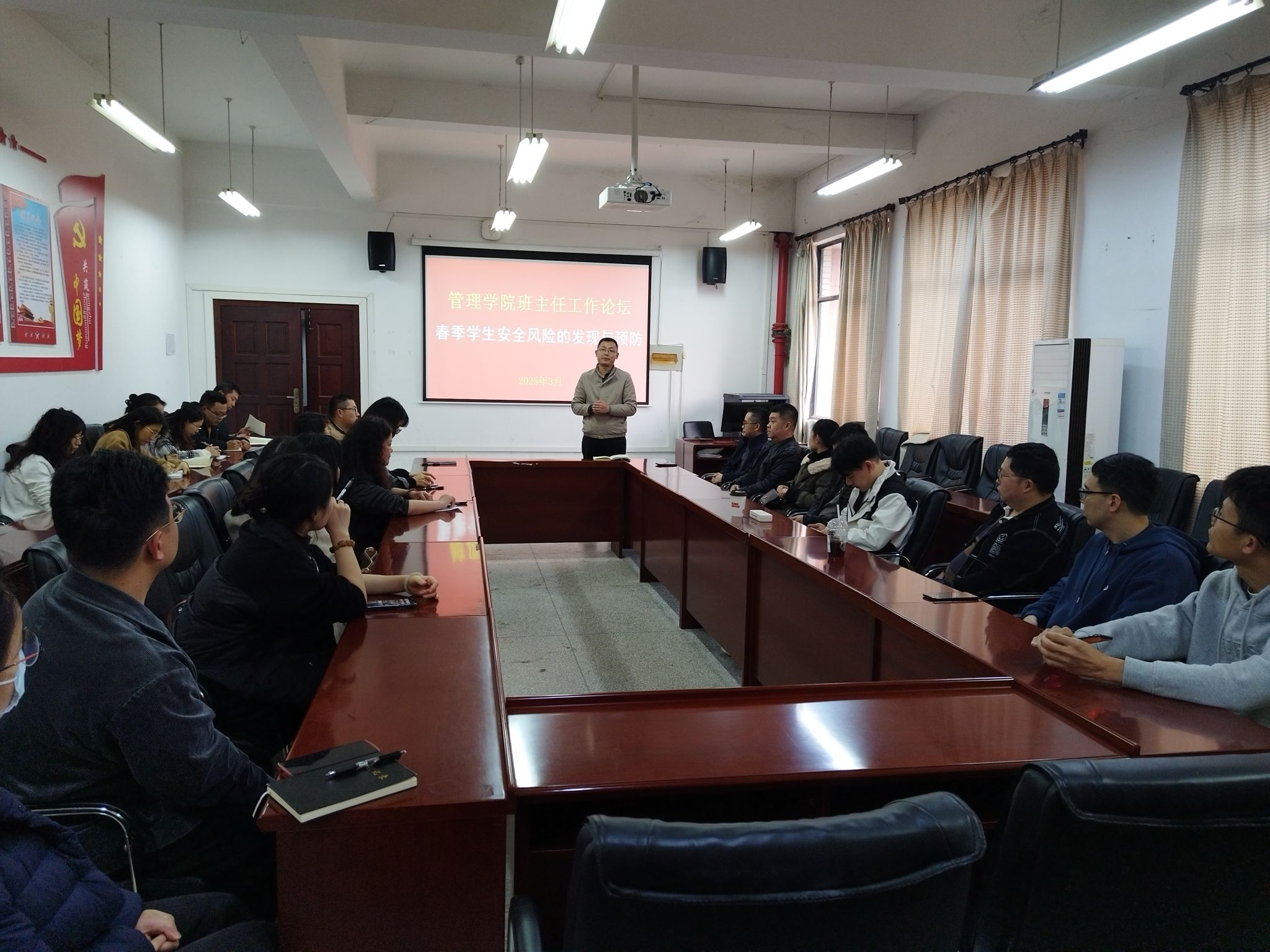 随后,与会的班主任围绕“春季学生安全风险的发现与预防”展开研讨。大家就如何及时发现风险隐患、切实做好预防举措进行交流,探讨从身体疾病、心理健康、学业预警、考研就业、电信网络诈骗等多方面进行观测,通过谈心谈话、网络交流、班级活动、团体辅导等方式开展班主任工作。