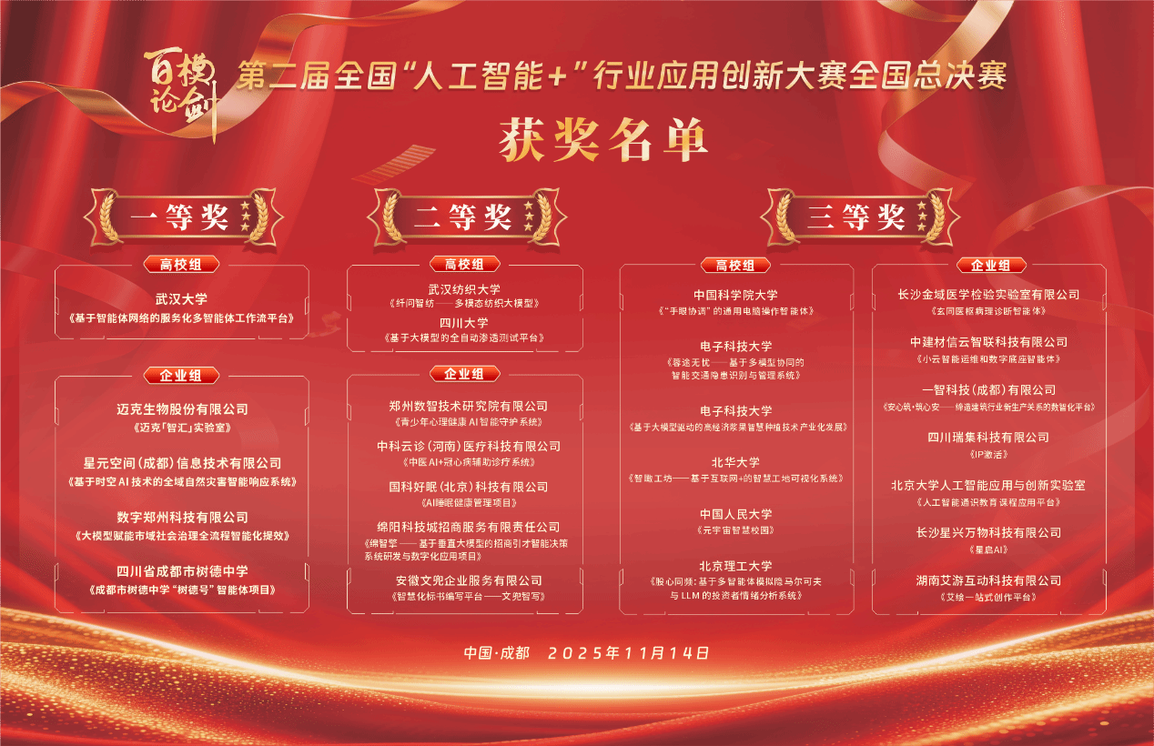 近日,百模论剑·第二届全国“人工智能+”行业应用创新大赛颁奖大会在成都成功举办。本次大赛以“赛聚英才,智链蓉城,以赛促产,生态成势”为主题,吸引了来自全国30余个省级行政区(含香港、澳门)的1500余支团队报名参赛。历经多轮选拔,最终共有55支优秀团队晋级全国总决赛。经过激烈角逐,永利集团汤逊湖纺织团队项目《纤问智纺——多模态纺织大模型》脱颖而出,荣获全国总决赛亚军,展现了我校在“人工智能+纺织”交叉领域的创新实力。
