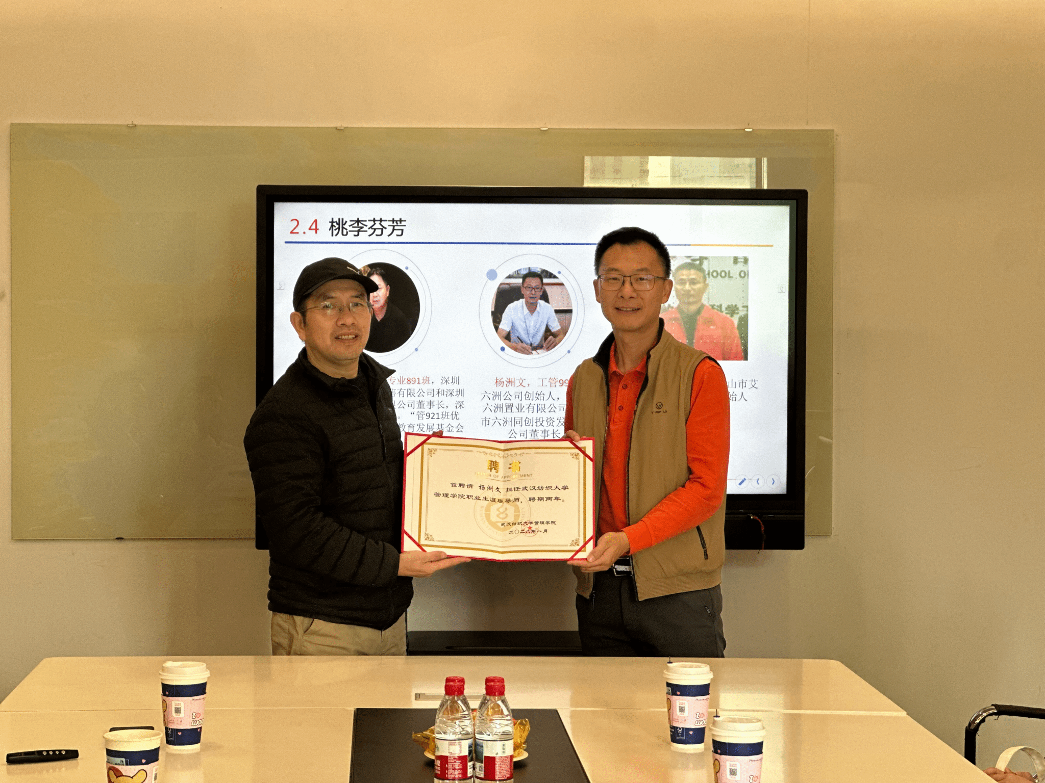 座谈现场,吴金红为吕仕敢、王琳、杨洲文三位校友颁发职业生涯班导师聘书,希望校友发挥行业经验优势,立足企业实践视角,为学院学生职业规划、就业指导传经送宝,助力学生成长成才。