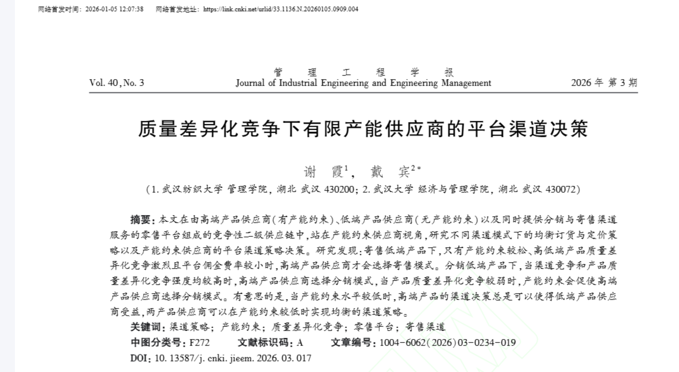 2026年1月5日,管理科学领域重要期刊《管理工程学报》官网上网络首发了我院谢霞副教授的学术论文《质量差异化竞争下有限产能供应商的平台渠道决策》。该论文探讨了产能约束、渠道竞争和质量竞争对供应商平台渠道策略的交互作用机制。该研究是谢霞副教授国自科基金资助项目的阶段性研究成果。yl9193永利集团谢霞副教授为该论文第一作者,武汉大学经济与yl9193永利戴宾教授为该论文的通讯作者。