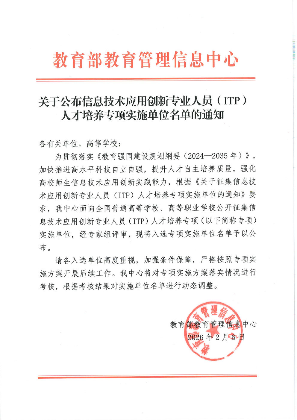 2026年2月6日由教育部教育管理信息中心组织专家组评审团多轮考核、评定后确定以下30所高校作为首批信息技术应用创新专业人员(ITP)人才培养专项实施培养单位: