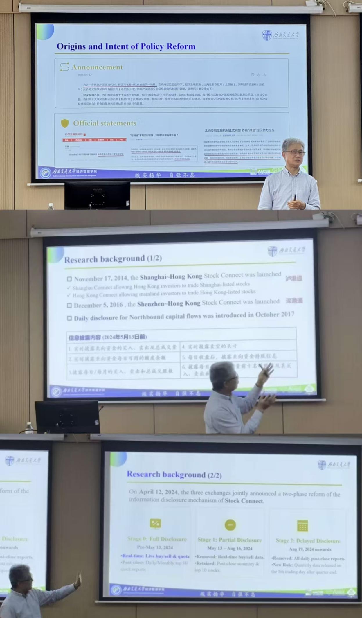 朱宏泉教授聚焦沪深港通交易信息披露机制改革这一前沿议题,系统剖析了改革对信息效率与市场质量的双重影响及其动态演化过程。他首先介绍了研究的背景与动机,指出沪深港通作为连接内地与香港资本市场的重要桥梁,其信息披露规则调整对市场参与者的行为和市场运行效率具有关键影响。