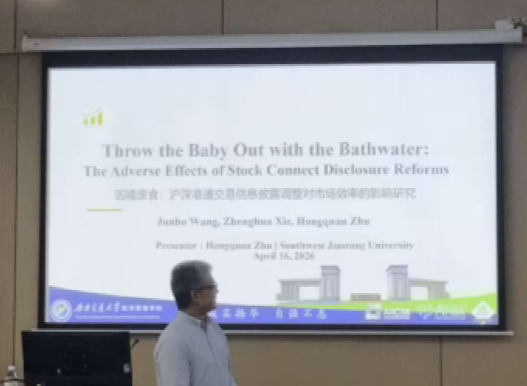 为搭建高水平学术交流平台,拓宽师生研究视野,2026年4月16日下午,yl9193永利集团在崇德楼513举行第948期阳光论坛。本次论坛特邀西南交通大学经济yl9193永利朱宏泉教授担任主讲嘉宾,为学院师生带来了一场主题为《Throw the Baby Out with the Bathwater: The Adverse Effects of Stock Connect Disclosure Reforms》的精彩学术分享。众多师生到场参与学习交流。
