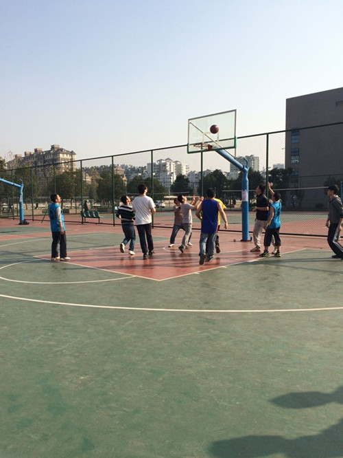 下午14:30,随着一声哨响,比赛正式拉开了帷幕。研究生队争得了第一次进攻的机会,但实力占据上风的教师队很快以8:2领先,并继续扩大比分优势。研究生队也不甘示弱,奋起直追,在第一节最后进攻阶段,以4分之差暂时落后。比赛进入第二节,师生双方都进行了相应的人员和战术调整,比赛更是高潮迭起,双方队员都打出了高水准的传球、带球、助攻、投球。第二节结束时,两队打成了平局。随着比赛进入下半场时间,双方体力消耗都较大,双方更多地使用技巧,韩烈老师利用身高优势连续得分,学生队也不甘落后,组织后卫连续突破上篮。场边的拉拉队员们为双方加油喝彩,更增添了一道靓丽的风景。经过激烈的角逐,双方最终以2:2握手言和。