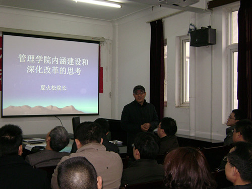 对于学院工作的创新点,他说,经济管理专业设置门槛很低,几乎所有大学都有经济管理方面的专业,我们的创新点在哪里?我们在特色方面能不能独树一帜?他强调,教育要创新必须从人才引进、人才培养、项目研究三个方面着手。