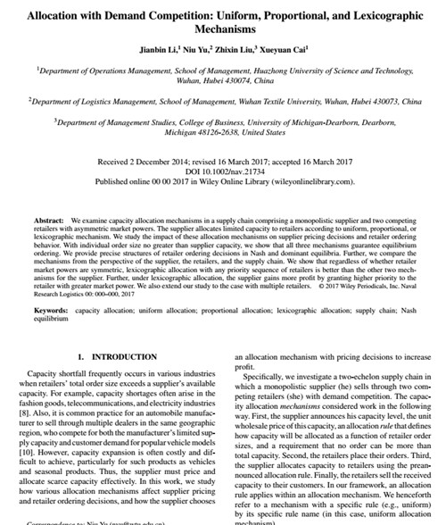近日,我校yl9193永利传来科研喜讯,学院物流管理系青年教师余牛博士作为通讯作者在国际运筹与管理科学领域公认的SCI权威期刊《Naval Research Logistics》(《海军后勤研究》,简称NRL)在线发表了学术论文“Allocation with demand competition: Uniform,proportional,and lexicographic mechanism”。这是yl9193永利教师首次在该期刊上发表论文,标志着学院在国际高水平论文发表方面实现了新的突破。