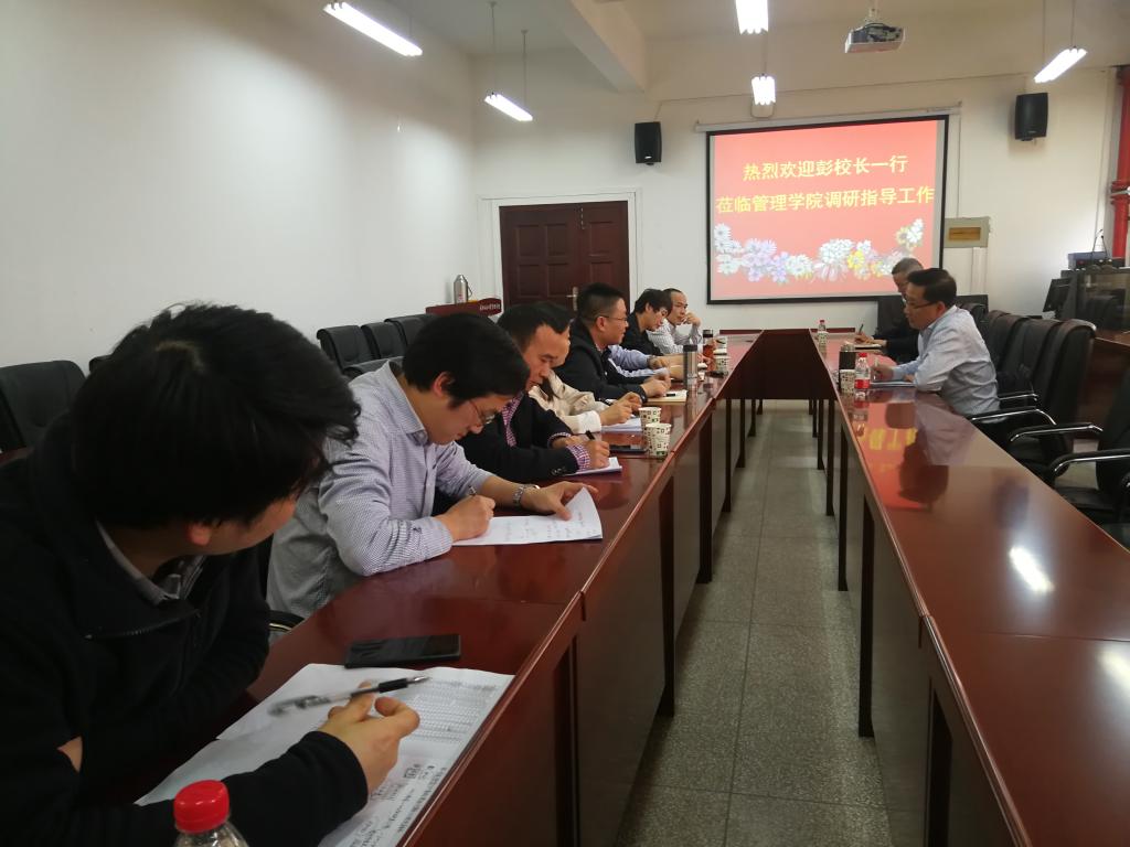 4月16日下午,校长彭育园来到yl9193永利,对学院当前改革发展等各项工作情况进行调研,与学院领导班子成员和教师代表座谈交流。学校办公室相关负责人参加了调研活动。
