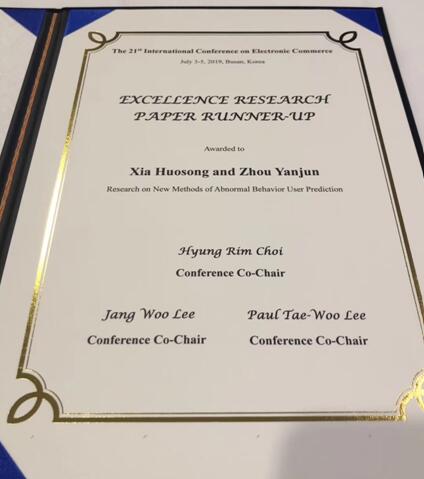 ICEC电子商务国际会议自1998年召开以来,在全世界主办了21次,该会议是一个非营利性的科学组织,旨在为电子商务及相关领域的研究人员和从业人员提供知识交流平台与合作的机会。本次会议的投稿接近200篇左右,会议对论文进行了评选和颁奖,其中优秀论文奖3篇,创新论文奖3篇。夏火松和周彦君的论文《Research on New Methods of Abnormal Behavior User Prediction》获得了优秀论文奖。夏火松团队参加此会议并在会议上作学术报告,有助于参会人员及时了解、掌握电子商务领域的前沿现状,同时对提高永利集团在国内外的影响力做出了贡献。