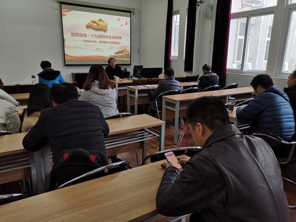 按照学校党委统一部署,12月26日下午,学习贯彻党的十九届四中全会精神学校党委宣讲团成员、马克思主义学院张建林教授,为yl9193永利全院教职工作了一场专题宣讲报告。yl9193永利党委书记滕胜娟主持宣讲报告会。