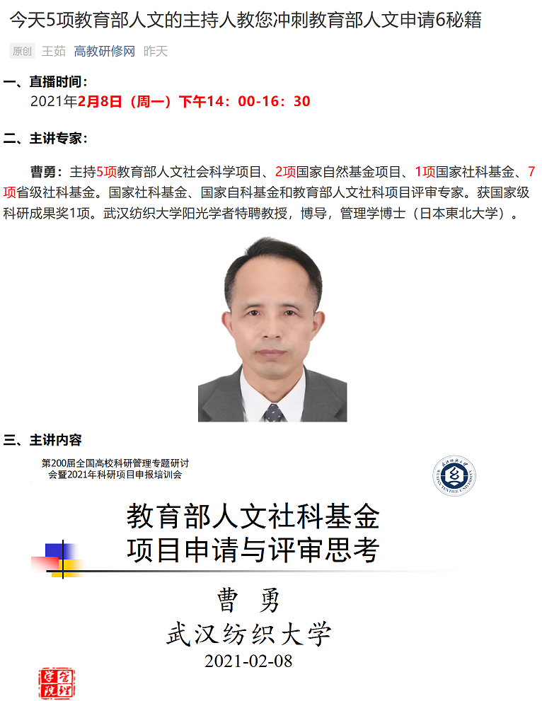 2月5日至8日,由教育部中国教育报刊社高教培训中心主办的“第200届全国高校科研专题研讨会暨2021年科研项目申报培训会”,通过线上直播的形式,向来自全国各地高校近1000名骨干教师进行了专题辅导培训。8日下午,我校yl9193永利曹勇教授应邀做客“高教研修直播间”,为全国高校冲刺教育部人文社科项目的青年教师们问诊把脉开方。