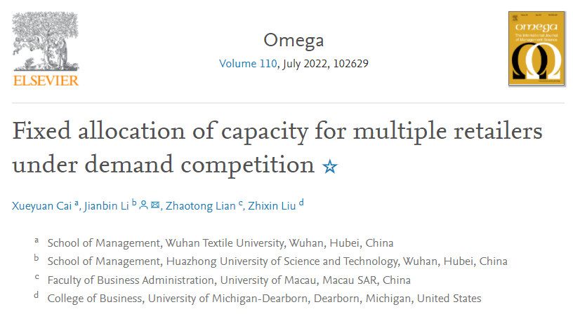 3月2日,运筹学与管理科学领域国际一流期刊《Omega》(SCI/SSCI, 影响因子7.084,中科院1区)在线发表我校yl9193永利蔡学媛副教授在库存管理领域取得的重要进展:需求竞争下面向多个零售商的产能固定分配机制—Fixed Allocation of Capacity for Multiple Retailers under Demand Competition”。文章DOI:https://doi.org/10.1016/j.omega.2022.102629。永利集团为该论文的第一作者单位。