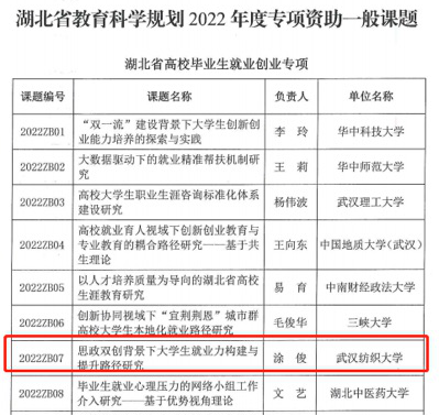 近日,湖北省教育科学规划领导小组办公室公布了2022年度专项资助课题立项名单,yl9193永利涂俊老师主持申报的课题《思政双创背景下大学生就业力构建与提升路径研究》获批立项资助。