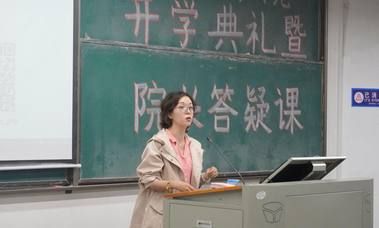 吴金红从学校概况讲起,为同学们介绍学校历史沿革、学院发展特色及不同学科方向的发展前景,提到学院有强大的师资队伍,建有多个实验与实践等创新平台,学科实力突出。随后,吴金红向同学们提出了四点建议。一是树立一个目标,明晰自己未来选择读研深造还是参与工作实践。二是打好两门基础,不断提升数学与英语水平。三是锻炼自身三项能力,即自主学习能力、沟通能力与创新能力。四是努力在大学阶段获取四个证书,有计算机等级证书、英语四六级证书、各项奖学金证书、毕业证和学位证证书。吴金红叮嘱同学们在校期间,要积极参与科研竞赛活动,将专业知识运用到实践中。