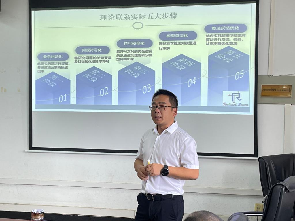 会上,李建斌教授做了题为:供应链仓储优化管理中的运筹学实践与应用--基于1号店、华为、1药网的学术报告,报告中,李建斌教授介绍了自己的学术成长历程,针对供应链优化框架,仓库布局优化策略等研究问题,以及实践与应用等方面进行了详细汇报,并简要介绍了所带团队在华为等企业项目经验与经历。李教授语言风趣幽默,深受现场老师好评。