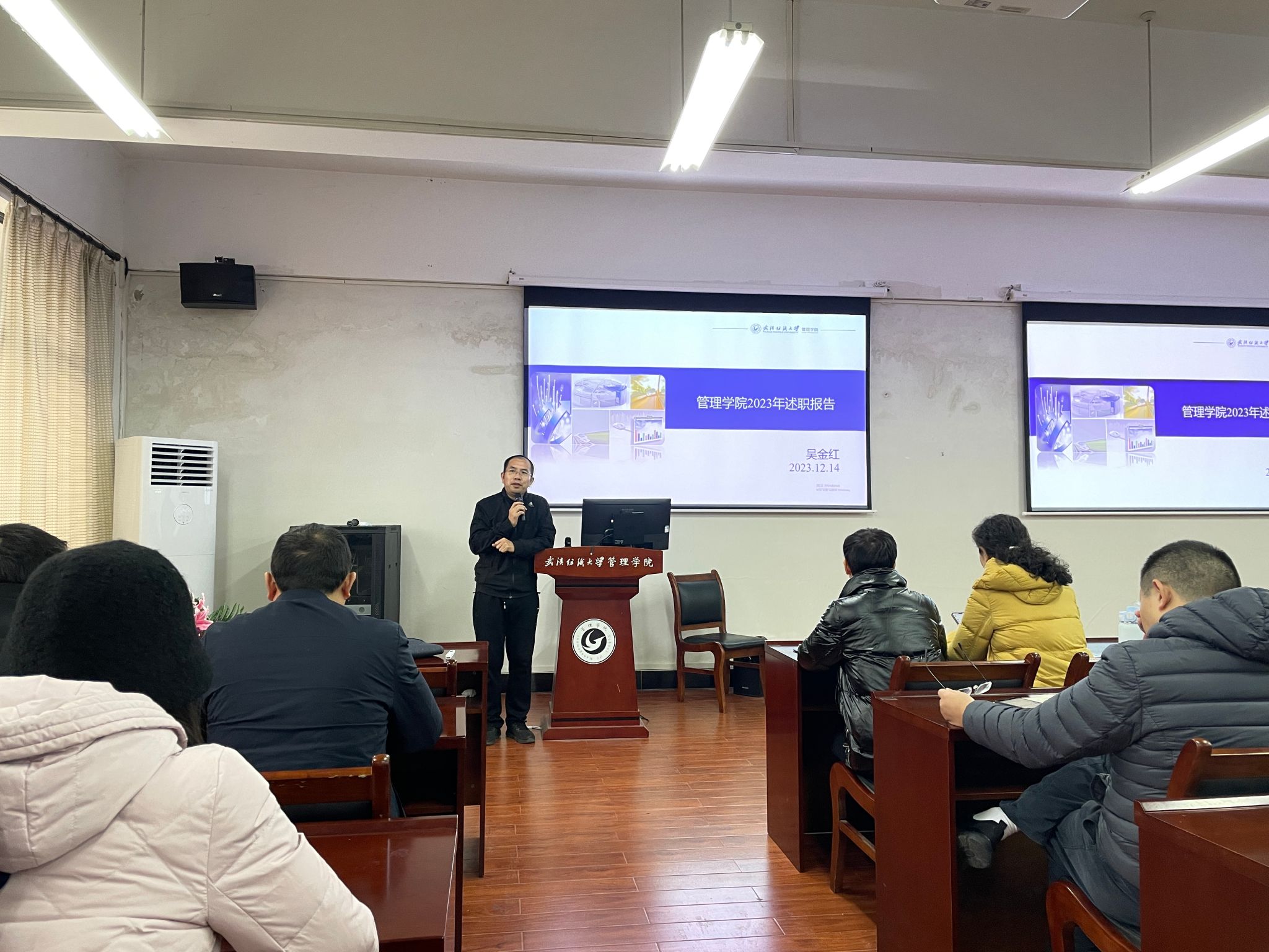 学院院长吴金红向全院教职工作述职报告。他从党建工作、本科教学工作、研究生工作、科研工作与成果、师资队伍与人才培养、学生工作和成效等方面对学院2023年的工作进行了全面回顾和系统总结,强调了年底的重点工作,他对全院教职工的辛勤工作表示感谢,鼓励各位职工向着年底目标再努力,凝心聚力,顺利完成年底工作。同时,报告中指出了班子工作中存在的不足,并提出了改进的方向措施。